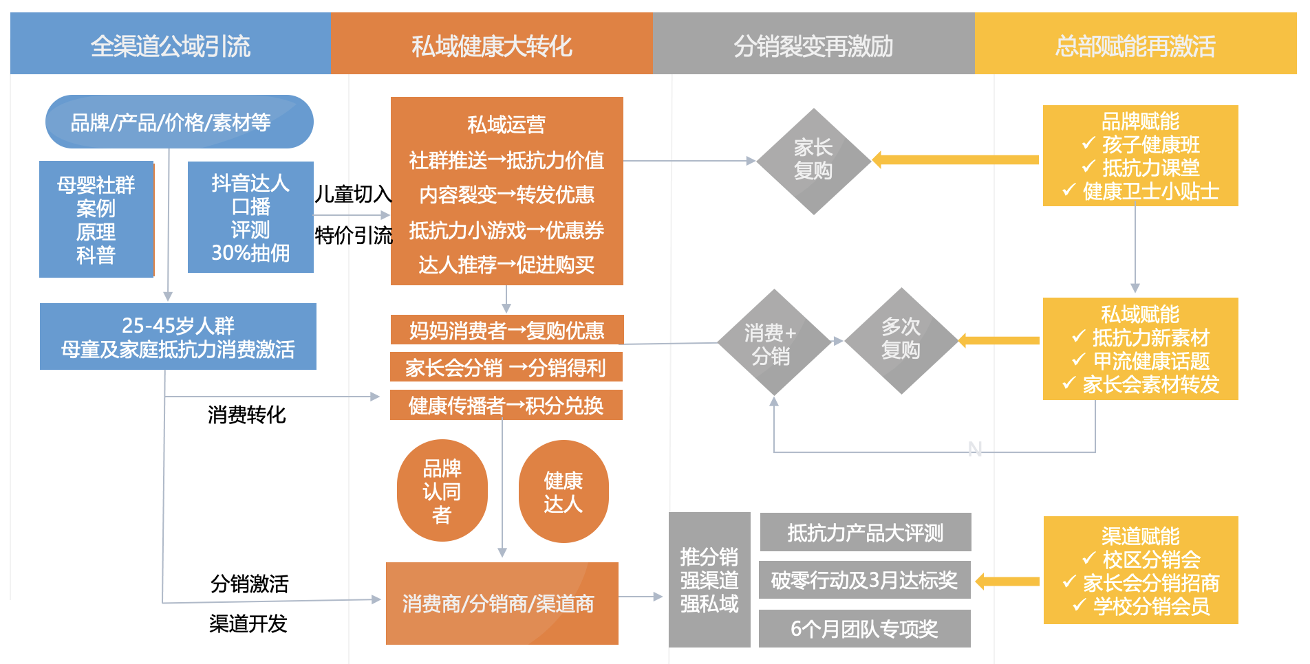 ——對于年輕消費(fèi)者,以“媽媽群體”為切入人群,激活其對兒童抵抗力的關(guān)注度,首先產(chǎn)生“兒童抵抗力”產(chǎn)品的購買,其次關(guān)注“成人活力”的提升,擺脫身體乏力、活力不足等情況,全力提升新產(chǎn)品價值。
