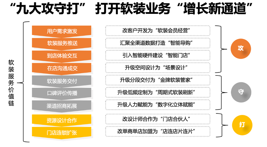 1)攻在“高價值需求激發(fā)”:以“軟裝會員經(jīng)營”為切入點,匯聚全渠道數(shù)據(jù)、打造“智能導(dǎo)購”,引入智能硬件、點亮門店磁石點、建設(shè)智能門店,同時升級空間設(shè)計為“場景設(shè)計”,全力搶占“軟裝價值制高點”。