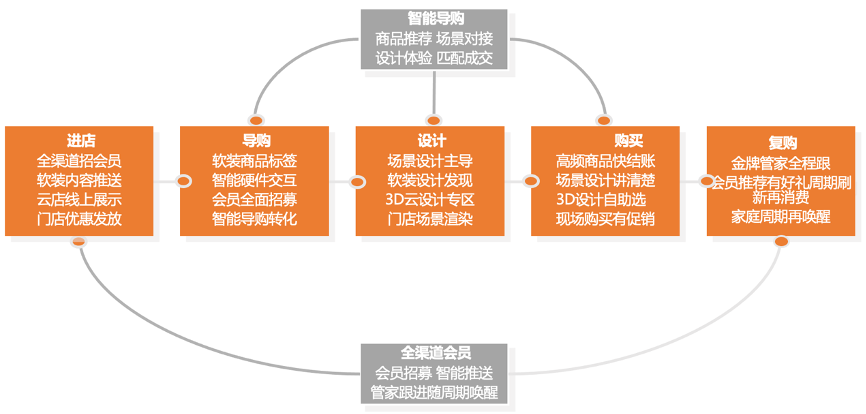 通過“全渠道會員”大力吸引軟裝用戶進店,開發(fā)新客戶,同時對接“老會員復(fù)購”,保證軟裝服務(wù)的“全渠道流量連通”;通過“智能導(dǎo)購”推進商品導(dǎo)購、軟裝場景設(shè)計及商品購買等,推動商品智能推薦、場景對接及設(shè)計的“新體驗”,共同助力門店“強運營”。