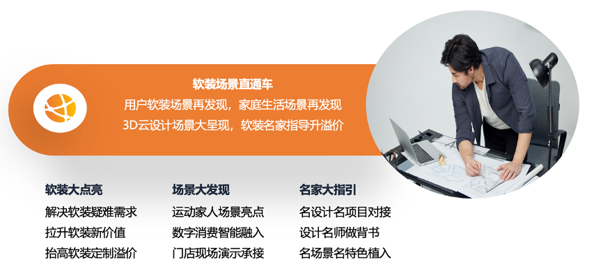 門店設(shè)置“3D云設(shè)計專區(qū)”:落地展示3D設(shè)計版塊,在“專區(qū)”和用戶溝通,通過在店交互讓用戶感受到“場景設(shè)計”的價值,與“軟裝場景直通車”相結(jié)合,以“場景設(shè)計名家”做背書,推動軟裝用戶轉(zhuǎn)化成交。