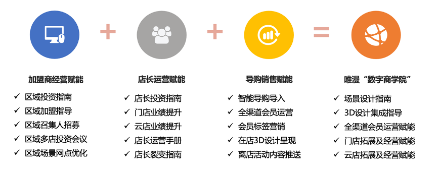 通過加盟商經(jīng)營賦能,規(guī)范投資運營、加盟指導(dǎo)、區(qū)域召集人招募等,強化加盟商經(jīng)營賦能;通過門店運營手冊、云店運營指導(dǎo)等,推動店長運營賦能;通過智能導(dǎo)購導(dǎo)入、會員標(biāo)簽營銷、在店3D設(shè)計呈現(xiàn)等,全面推動導(dǎo)購銷售賦能;突出場景設(shè)計指南、3D設(shè)計集成等,通過“數(shù)字商學(xué)院”對區(qū)域運營大賦能。
