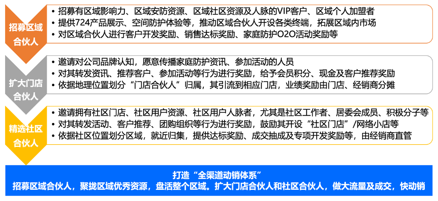 同時積極打造“全渠道動銷體系”。通過招募區(qū)域合伙人,聚攏區(qū)域優(yōu)秀資源,盤活整個區(qū)域。通過擴大門店合伙人和社區(qū)合伙人,做大流量及成交,快動銷。