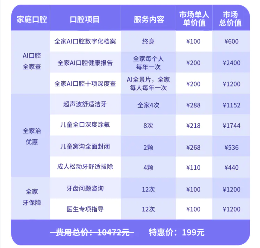 考慮到口腔消費(fèi)屬于低頻、高價(jià)格的消費(fèi),韜慧咨詢建議億大全面激活“家庭口腔卡”消費(fèi),延續(xù)現(xiàn)有的AI口腔數(shù)字化檢查、AI口腔健康報(bào)告等口腔優(yōu)惠服務(wù),增加潔牙、涂氟、拔牙等常規(guī)優(yōu)惠服務(wù),同時(shí)放大醫(yī)患社群價(jià)值,提供牙齒問(wèn)題咨詢、醫(yī)生專項(xiàng)指導(dǎo)等口腔在線服務(wù),提升醫(yī)患交流頻率,大力提升口腔個(gè)人用戶及家庭的“消費(fèi)黏性”。