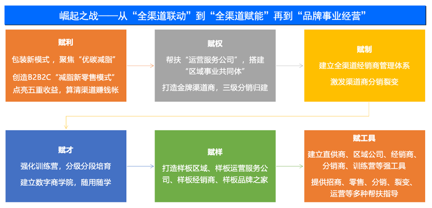 1)樣板區(qū)域打造。選擇設立“運營服務公司”、高業(yè)績成交額、高價值認同度、高業(yè)務配合度的區(qū)域;培育金牌直供商,升級現(xiàn)有門店,賦能渠道商拓展分銷,增強“門店減脂消費體驗”。