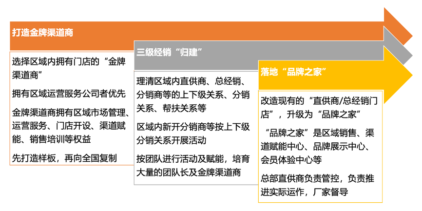 1)直供商做區(qū)域。以“直供商”為市場操作主體,強化直供商區(qū)域市場及品牌社群主導地位;提供直銷商區(qū)域業(yè)績分紅、區(qū)域業(yè)績抽成及管理費用等;強化區(qū)域“品牌之家”開設,落地終端。