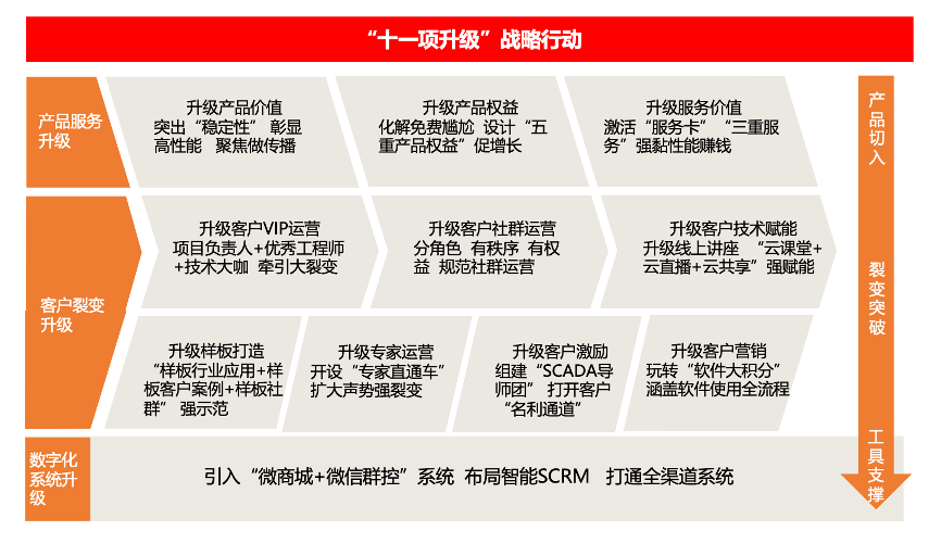 2. “客戶裂變升級”。升級客戶VIP運營,抓住項目負責人、優(yōu)秀工程師等軟件使用的“關鍵決策人物”,提供其客戶使用體驗;升級客戶微信群運營,激發(fā)產品的使用率。升級線上講座,植入“技術云課堂+云直播+云共享”,智能化推送專用技術資訊,全力提升用戶的消費黏性。同時積極打造樣板,開設“專家直通車”,組建“SCADA導師團”,玩轉“軟件大積分”,使客戶大裂變快增長。