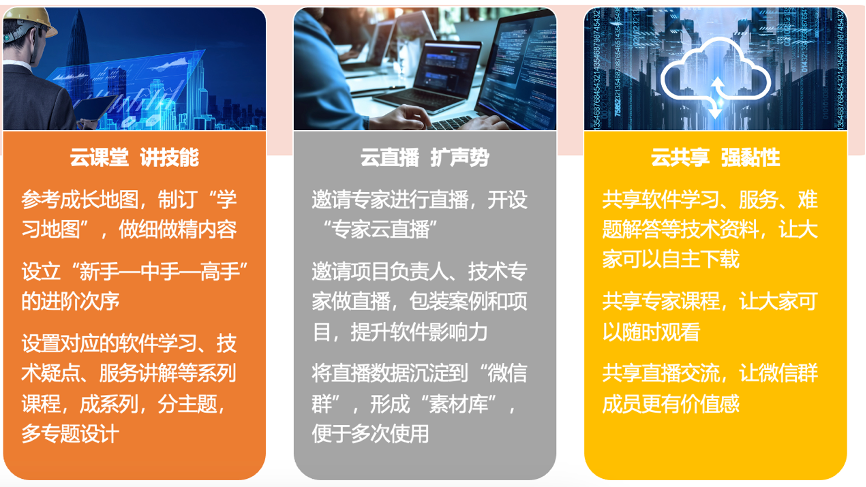通過“云課堂”全面聚集工程師等用戶,制訂“學習地圖”,將軟件使用、軟件服務等做精做細,推動用戶“新手—中手—高手”的持續(xù)進階。通過“云直播”邀請行業(yè)專家來直播,邀請項目負責人等講解經典案例,將直播數(shù)據(jù)沉淀到“微信群”,賦能到社群經營。通過“云共享”放置軟件使用、軟件消費及軟件服務等機制,共享各類軟件資料及專家課程,讓客戶技術提升更快,讓軟件價值更突出。