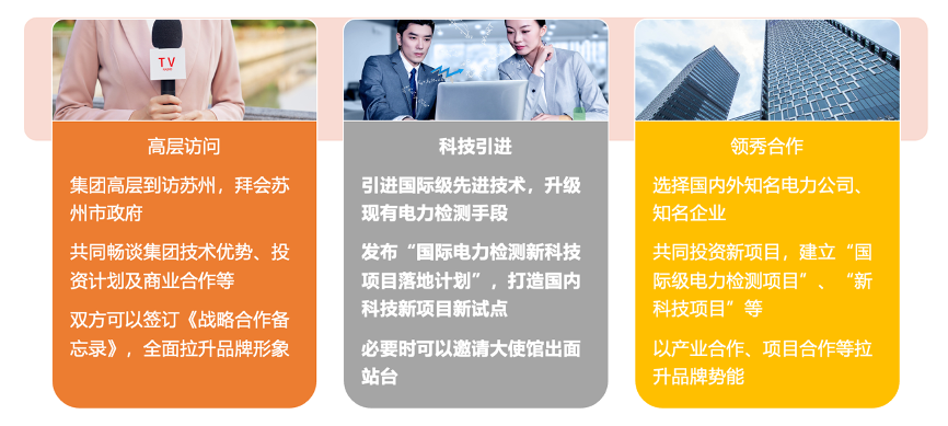 通過高層訪問、科技引進(jìn)等提升政府關(guān)注度,抓住國內(nèi)外知名電力公司、知名企業(yè)等,建立“國際級電力檢測項(xiàng)目”、“新科技項(xiàng)目”等,讓公司發(fā)揮“國際級影響力”。