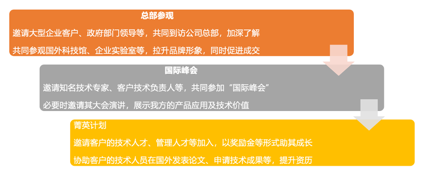 同時(shí)通過“走出去”,通過總部參觀、國際峰會、菁英計(jì)劃等立足國際強(qiáng)交流;同時(shí)強(qiáng)化“沉下去”,行業(yè)論壇擴(kuò)大聲勢,通過行業(yè)展會強(qiáng)化價(jià)值,通過區(qū)域研討會重成交,通過技術(shù)對接會強(qiáng)黏性,推動(dòng)“四會聯(lián)動(dòng)”。