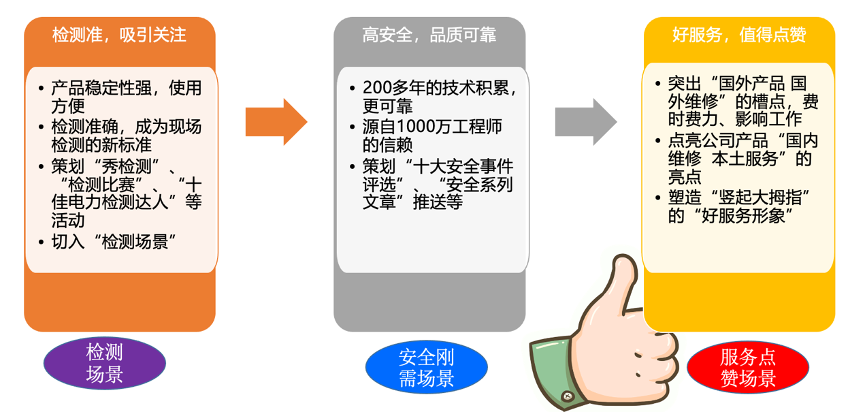 傳統(tǒng)的電力檢測客戶大多集中在“產(chǎn)品的準(zhǔn)確性及高效方面”,而Megger梅凱在保證“精準(zhǔn)檢測”的基礎(chǔ)上,持續(xù)創(chuàng)新,對政府類客戶強(qiáng)調(diào)“科技感”,對企業(yè)類客戶強(qiáng)調(diào)“價(jià)值”,對消費(fèi)者強(qiáng)調(diào)“場景感”,分類型傳遞價(jià)值,打造“產(chǎn)業(yè)強(qiáng)品牌”。