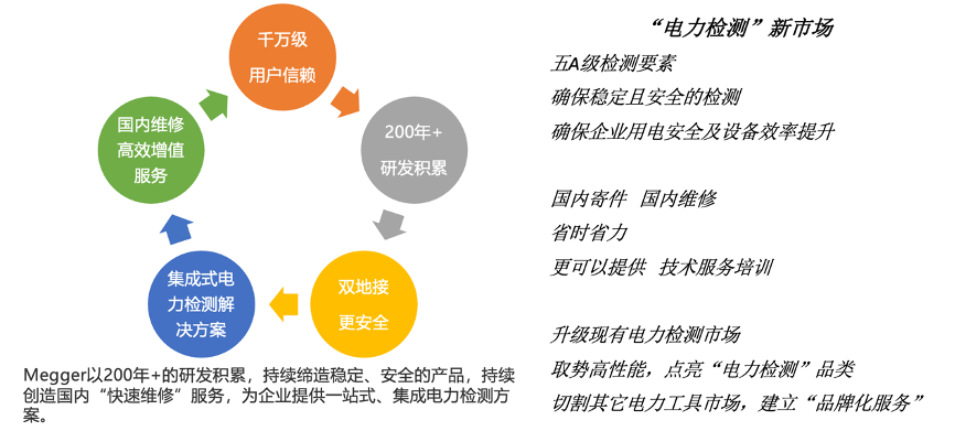 Megger以200年+的研發(fā)積累,持續(xù)締造穩(wěn)定、安全的產(chǎn)品,持續(xù)創(chuàng)造國內(nèi)“快速維修”服務(wù),為企業(yè)提供一站式、集成電力檢測方案;全面挖掘“5A級要素”,以“強(qiáng)技術(shù)”升級2B電力檢測市場。