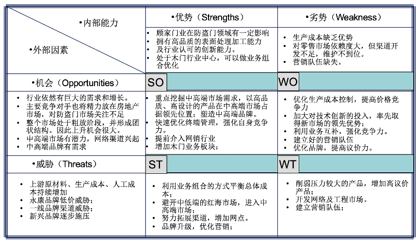 雙方進行了深度診斷及剖析,經(jīng)過對顧家門業(yè)的SWOT分析,一致認為:顧家門業(yè)需要逐步轉(zhuǎn)換發(fā)展思路,在穩(wěn)定和強化零售市場的前提下,大力拓展新渠道市場,打造營銷團隊,同時在內(nèi)部強化品牌管理及服務能力。韜慧咨詢合伙人在某公司深度策劃此項目,對此也深表認同。