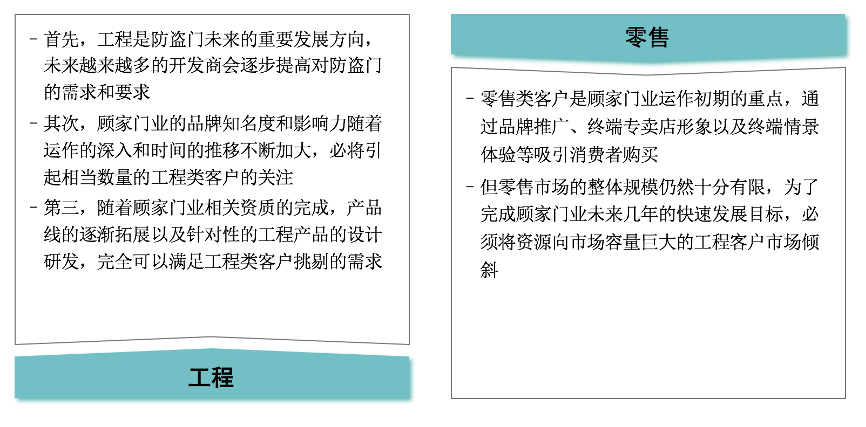 顧家門業(yè)渠道策略總原則應是零售渠道以總經(jīng)銷制為主,兼顧工程渠道,但隨著顧家門業(yè)運作的不斷深入和品牌影響力不斷加大,并逐漸向工程類客戶傾斜。