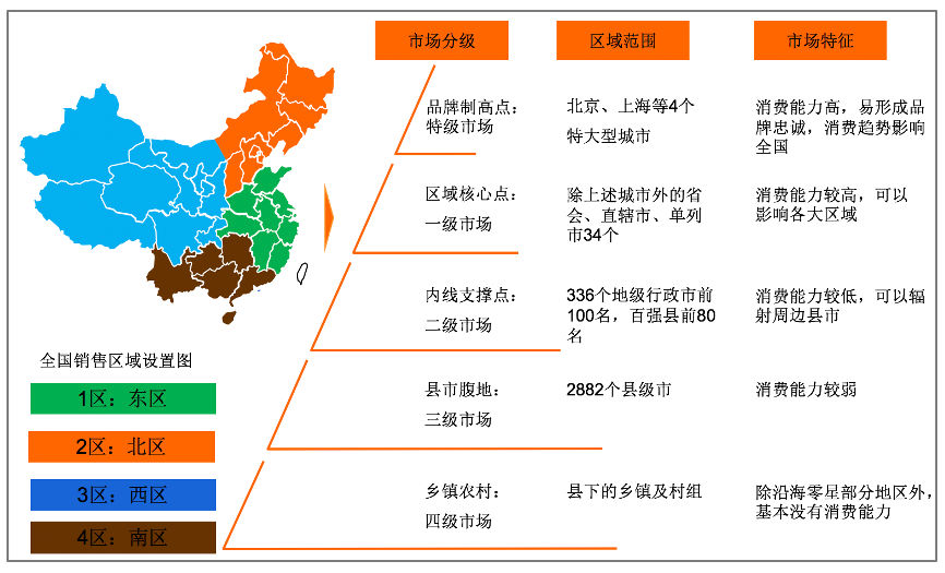 顧家門業(yè)按照行政區(qū)域設置四個大區(qū),并根據(jù)全國區(qū)域市場分級及其市場設置總市場布局如下:“一線城市全部占領、二線城市全面覆蓋、三四城市保證可見”。