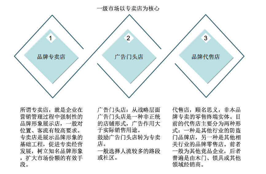 顧家門業(yè)終端策略的大原則是:專賣店為主,門頭店為輔,控制代售店。并從政策上激勵專賣店,鼓勵廣告門頭店轉(zhuǎn)為專賣店,爭取代售店成為門頭店。