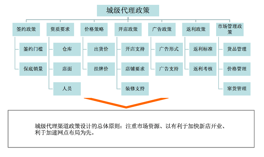 省級代理渠道政策的重點:第一、激發(fā)省級代理的銷售激情;二是渠道拓展及維護,空白市場的拓展和現(xiàn)有市場的強化;三是圍繞門店數(shù)量快速增加進行專賣店建設,快速有效地實現(xiàn)目標市場覆蓋。