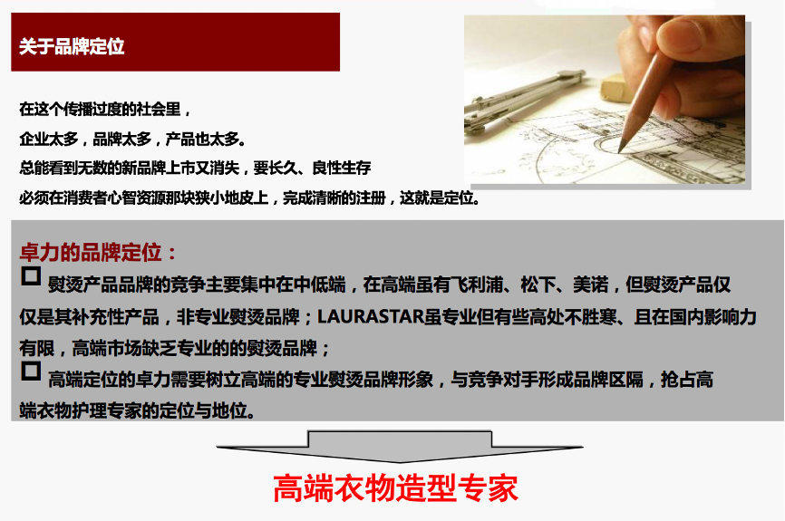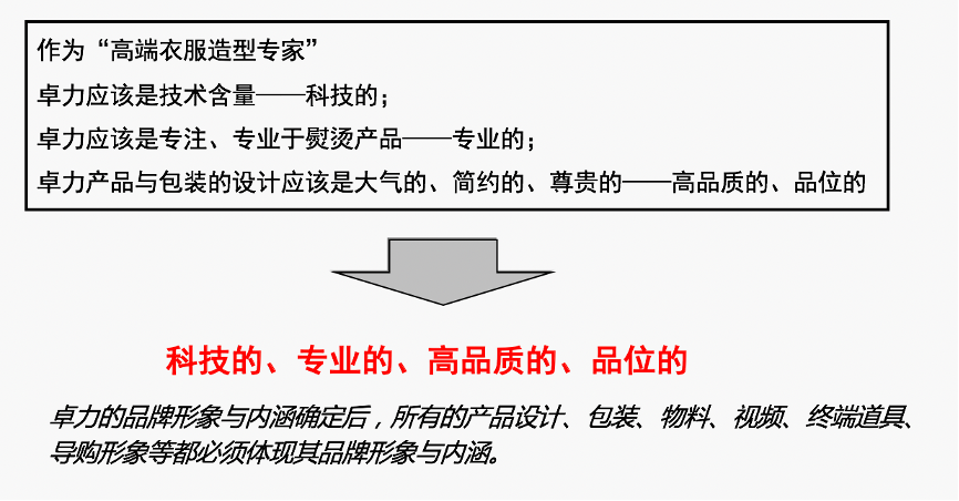 項目組參考國內(nèi)外電器市場經(jīng)營,建議卓力品牌傳播的整體策略方面堅持“趨優(yōu)”導向,聚焦中高端人群的熨燙需求,強化卓力品牌的“專家型定位”、“高端形象”,與中高端人群親密接觸。
