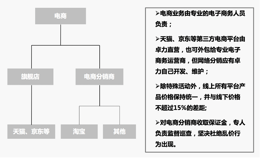 天貓、京東等第三方電商平臺由卓力直營,也可外包給專業(yè)電子商務(wù)運營商,但網(wǎng)絡(luò)分銷應(yīng)有卓力自己開發(fā)、維護。