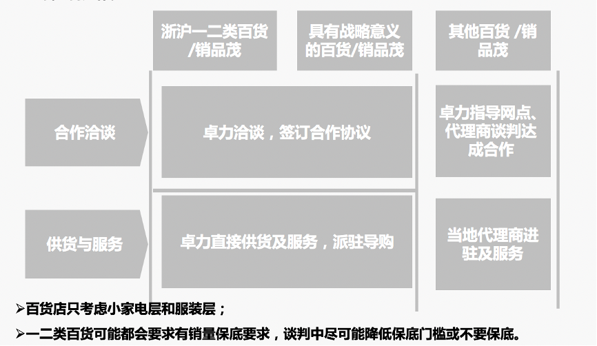 百貨/shopingmall/區(qū)域綜合體是卓力最好的品牌形象支撐渠道,但卓力鎖定的只是一二類百貨,除第一年進駐的百貨和后期對卓力具有戰(zhàn)略意義的百貨由卓力直營外,其他百貨/shopingmall/區(qū)域綜合體全部交給當?shù)卮砩踢\作。