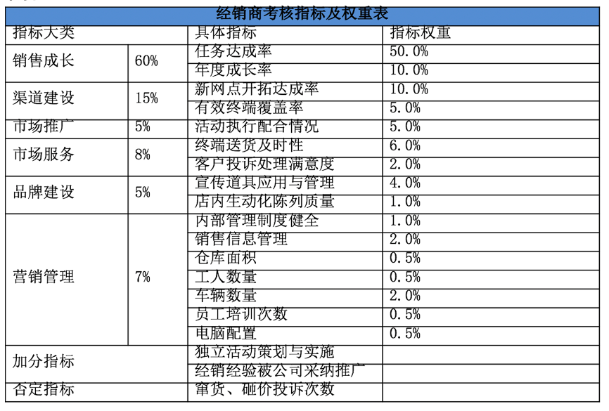 1)五星經(jīng)銷商篩選時從銷售成長、渠道建設和市場推廣等方面強化指引,賦予各指標以不同權重,尤其強調“銷售成長”的指標權重設置。