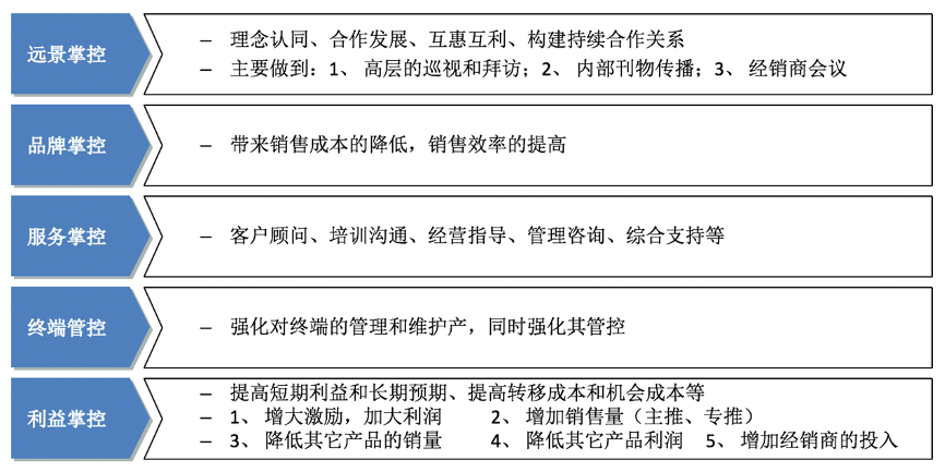 4)強化對經(jīng)銷商的掌控,從發(fā)展遠景、經(jīng)銷品牌、服務及終端等方面強化對經(jīng)銷商的掌控,強化廠商的創(chuàng)新合作。