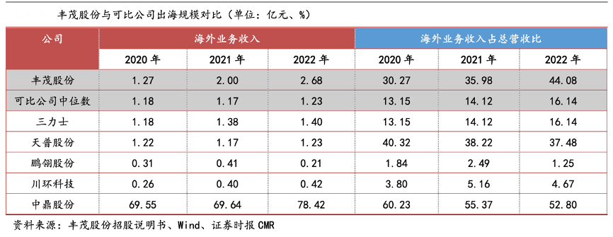 經(jīng)典案例:根據(jù)豐茂股份招股書、wind、證券時報CMR等資訊表明,豐茂股份公司作為橡膠傳動帶行業(yè)龍頭之一,其橡膠帶傳動系統(tǒng)產(chǎn)品在市場中具有較高的美譽(yù)度、知名度和明顯的競爭優(yōu)勢,先后榮獲“優(yōu)秀供應(yīng)商”、“質(zhì)量信得過供應(yīng)商”、 “傳動帶行業(yè)八強(qiáng)企業(yè)”等榮譽(yù)。據(jù)招股書披露,公司出海規(guī)模居可比公司前列,2020-2022 年出海規(guī)模逐年遞增, 2022 年達(dá)到 2.68 億元,2020-2022 年公司海外營收貢獻(xiàn)度穩(wěn)定增長,2022 年達(dá)到44.08%。