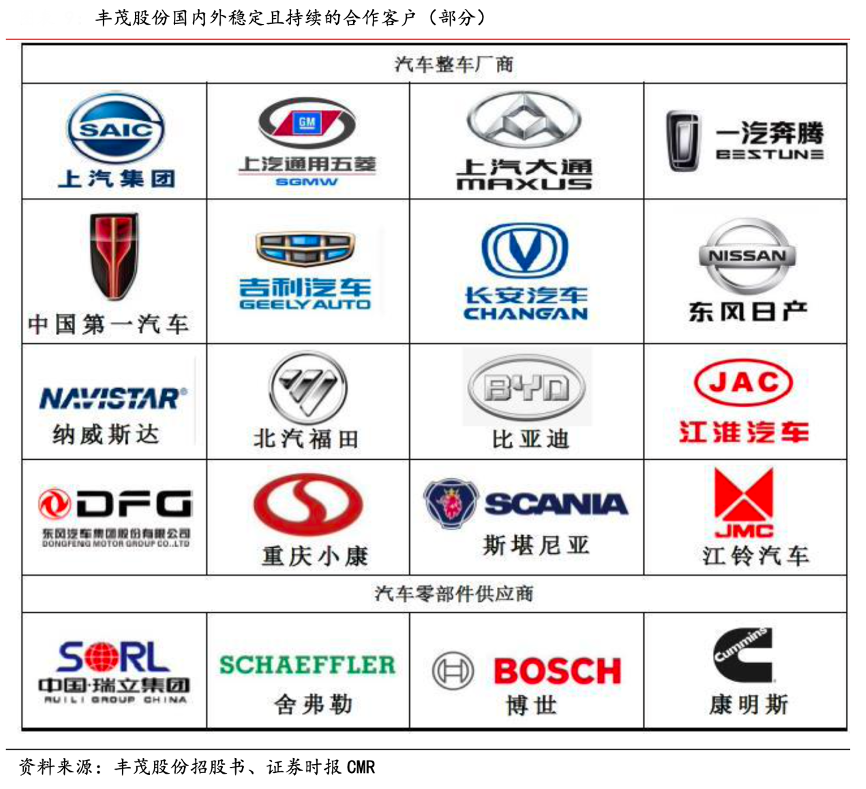 經(jīng)典案例:根據(jù)豐茂股份招股書、證券時報CMR等資訊表明,豐茂股份憑借產(chǎn)品品質(zhì)優(yōu)異、產(chǎn)品型號豐富、售后服務(wù)良好等優(yōu)勢,公司實現(xiàn)了較高的客戶滿意度及較強(qiáng)的行業(yè)影響力。公司已發(fā)展成為上汽集團(tuán)、一汽集團(tuán)、吉利汽車、長 安汽車、東風(fēng)日產(chǎn)、納威斯達(dá)等國內(nèi)外知名整車廠,以及瑞立集團(tuán)、康明斯、博世、LNDISTRIBUTION LLC、舍弗勒、邁樂、米其林等知名汽車零部件企業(yè)的合格供應(yīng)商,并與之建立了長期穩(wěn)定的合作關(guān)系。