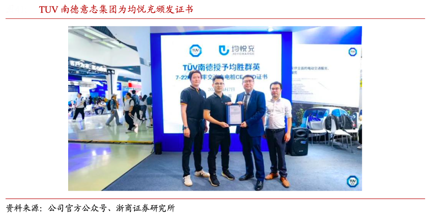 經(jīng)典案例:根據(jù)公司官方公眾號、浙商證券研究所等綜合資訊表明,均悅充旗 下“均悅·享”智能交流樁、隨車充等多產(chǎn)品在 2022 年獲得歐標(biāo)認(rèn)證,為進軍歐洲市場提 供基礎(chǔ)。2023 年 6 月 7 日,均悅充旗下 7-22kW 功率交流充電樁(歐標(biāo))獲得了 TUV 南德 意志集團頒發(fā)的“TUV 南德安全認(rèn)證”及“CE-RED”證書,再一次證明了公司的研發(fā)實力,彰顯產(chǎn)品核心競爭力。