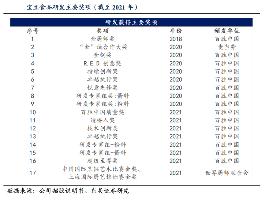 經(jīng)典案例:根據(jù)公司招股說明書、東吳證券研究等綜合資訊表明,寶立食品有著一套十分完善的產(chǎn)品研發(fā)流程,從立項、開發(fā)、產(chǎn)品測試和評審到試產(chǎn)和客戶最終確認,一系列流程均由客戶參與,保障著 B 端客戶的權益與需求。在研發(fā)能力方面,公司在近兩年也獲得了十余項產(chǎn)品研發(fā)獎項。