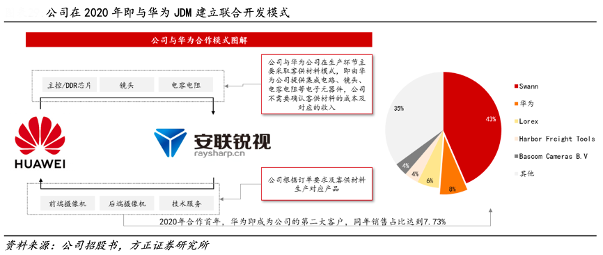 經(jīng)典案例:根據(jù)公司招股書(shū)、方正證券研究所等綜合資訊表明,安聯(lián)銳視2020 年即與華為建立 JDM 聯(lián)合開(kāi)發(fā)模式,對(duì)公司業(yè)務(wù)產(chǎn)生明顯推動(dòng)。公司于 2020 年 3 月通過(guò)華為公司的供應(yīng)商評(píng)審,成為其 JDM(聯(lián)合開(kāi)發(fā))供應(yīng)商,顯著提高 了公司在國(guó)內(nèi)工程類客戶的競(jìng)爭(zhēng)力。作為戰(zhàn)略客戶,公司全面改進(jìn)現(xiàn)有生產(chǎn)經(jīng) 營(yíng)體系,并投入大量資金購(gòu)置設(shè)備和軟件、投入大量人力資源提升業(yè)務(wù)流程,相應(yīng)產(chǎn)品產(chǎn)能出現(xiàn)大幅提升。