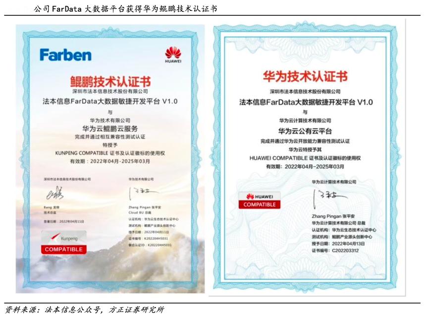 經(jīng)典案例:根據(jù)法本信息公眾號、方正證券研究所等綜合資訊表明,F(xiàn)arData 大數(shù)據(jù)平臺獲鯤鵬云技術(shù)信創(chuàng)認證,攜手華為共建數(shù)字化云生態(tài)。2022 年 4 月,公司 FarData 大數(shù)據(jù)敏捷開發(fā)平臺憑借其高度的成熟性和強大的開放 性,完成了與華為云和華為 GaussDB 和 MRS 的集成和認證,獲華為云鯤鵬云服務等信創(chuàng)認證,正式加入華為云“沃土云創(chuàng)”計劃。