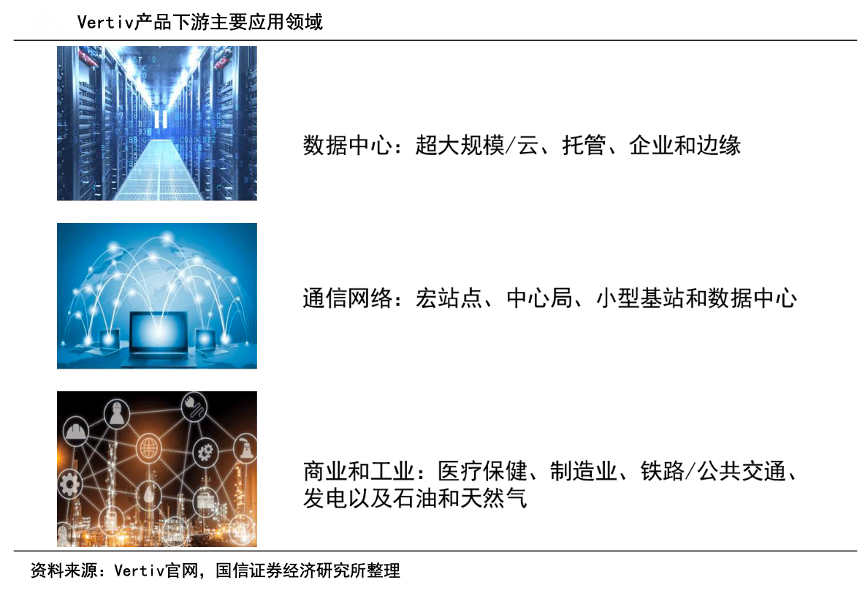 經(jīng)典案例:根據(jù)Vertiv官網(wǎng)、國(guó)信證券經(jīng)濟(jì)研究所等綜合資訊表明,Vertiv公司業(yè)務(wù)圍繞電力、冷卻和IT管理展開,下游主要涉及數(shù)據(jù)中心、通信網(wǎng)絡(luò)以及商業(yè)和工業(yè)環(huán)境三大領(lǐng)域。公司主要提供從云到網(wǎng)絡(luò)邊緣的電力、冷卻和IT基礎(chǔ)設(shè)施解決方案和服務(wù),具體產(chǎn)品包括基礎(chǔ)設(shè)施和解決方案(交流和直流電源管理、熱管理、低/中壓開關(guān)設(shè)備、母 線槽和集成模塊化解決方案)等。