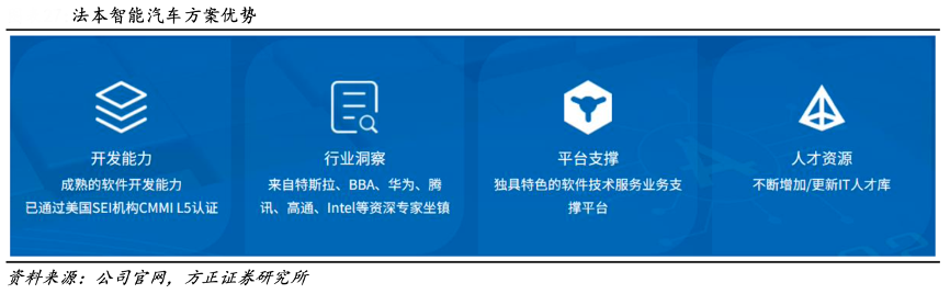 經(jīng)典案例:根據(jù)公司官網(wǎng)、方正證券研究所等綜合資訊表明,法本信息定位于智能座艙國(guó)產(chǎn)方案提供商,拓展智能化能力。公司在座艙領(lǐng)域定位于智能座艙國(guó)產(chǎn)化解決方案提供商,圍繞國(guó)產(chǎn)化主芯片和國(guó)產(chǎn)化操作系統(tǒng)為客戶提供國(guó)產(chǎn)化智能座艙解決方案,支持高度定制化研發(fā)交付。其推出軟件平臺(tái) FarCarOS,進(jìn)一步拓展智能化能力。除了導(dǎo)航、音樂(lè)、娛樂(lè)、 語(yǔ)音交互外,支持 360 環(huán)視、DMS 眼動(dòng)追蹤、健康監(jiān)測(cè)、云游戲等創(chuàng)新業(yè)務(wù)功能。