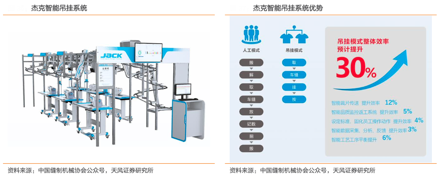 經(jīng)典案例:根據(jù)中國縫制機(jī)械協(xié)會公眾號、天風(fēng)證券研究所等綜合資訊表明,杰克股份公司智能吊掛系統(tǒng)能減少人力、提高效率、優(yōu)化管理。智能吊掛系統(tǒng)是一套智能單軌道、服裝、家紡、汽配等生產(chǎn)流水設(shè)備,采用電腦化管理及數(shù)據(jù)庫、管理軟件、電子技術(shù)、RFID 射頻技術(shù)、工業(yè)自控技術(shù)及新型傳動機(jī)構(gòu)來代替?zhèn)鹘y(tǒng)生產(chǎn)方式,實(shí)現(xiàn)整個生產(chǎn)流程的信息化與高效化。智能吊掛系統(tǒng)已經(jīng)切實(shí)應(yīng)用于佳都集團(tuán)、盛寶麗集團(tuán)、可祺時裝等大型服裝企業(yè),并遠(yuǎn)銷海外越南、緬甸、柬埔寨、泰國、埃塞俄比亞、孟加拉等國家。