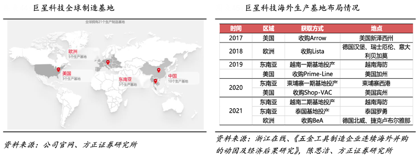 經(jīng)典案例:根據(jù)公司官網(wǎng)、浙江在線、《五金工具制造企業(yè)連續(xù)海外并購的動因及經(jīng)濟后果研究》、陳思潔、方正證券研究所等綜合資訊表明,目前巨星科技公司在全球擁有 20 處生產(chǎn)制造基地,主要通過“自主建廠+并購”的方式, 逐步建立起以亞太地區(qū)為核心,歐美產(chǎn)能為補充的全球化生產(chǎn)基地,能夠全面滿 足各類需求和應(yīng)對各自復(fù)雜的外部環(huán)境。