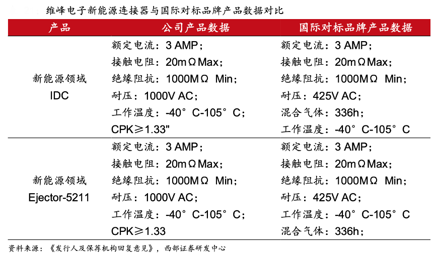 經(jīng)典案例:根據(jù)《發(fā)行人及保薦機構(gòu)回復意見》、西部證券研發(fā)中心等綜合資訊表明,新能源連接器生產(chǎn)體系與工控連接器大體通用,維峰電子公司存在制造優(yōu)勢,其憑借工業(yè)控制連接器生產(chǎn)體系和相關技術,在新能源連接器領域存在一定優(yōu)勢。目前,公司部分新能源連接器產(chǎn)品已達到或接近國際對標品牌技術水平。