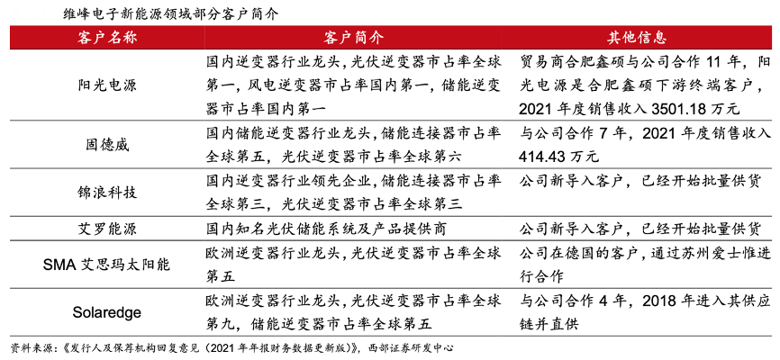 經(jīng)典案例:根據(jù)《發(fā)行人及保薦機構(gòu)回復意見(2021年年報財務數(shù)據(jù)更新版》、西部證券研發(fā)中心等綜合資訊表明,在新能源領域,維峰電子公司產(chǎn)品主要應用在 太陽能、風能和儲能逆變系統(tǒng),對應客戶包括陽光電源、固德威、錦浪科技、艾羅能源、 SMA、Solaredge 等逆變器及其他配件廠商。公司與國內(nèi)主要新能源企業(yè)合作多年。2020 年合肥鑫碩(陽光電源向公司采購連接器的貿(mào)易商)、固德威兩家企業(yè)占公司新能源業(yè)務 約 90%,公司與合肥鑫碩合作 11 年,與固德威合作 7 年,客戶關系穩(wěn)固。。