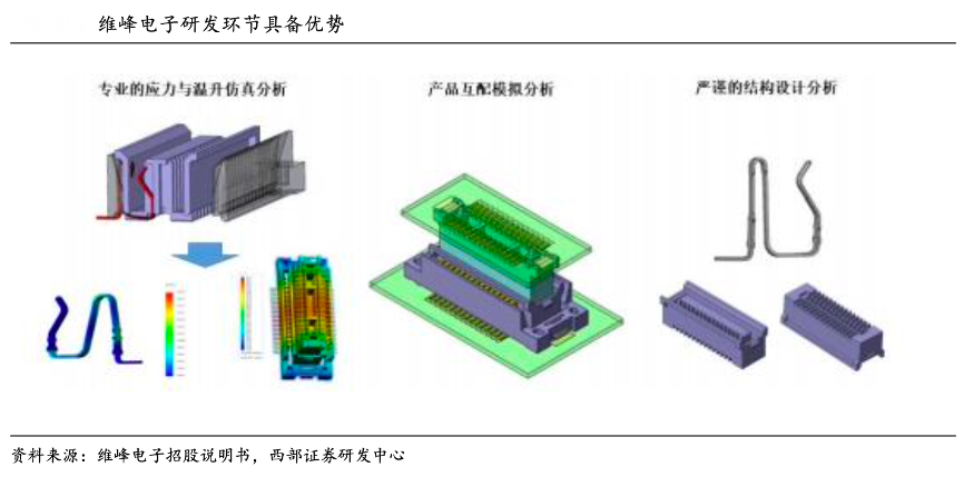 經(jīng)典案例:根據(jù)維峰電子招股說(shuō)明書(shū)、西部證券研發(fā)中心等綜合資訊表明,在產(chǎn)品設(shè)計(jì)階段,維峰電子公司較早建立電子連接器技術(shù)研發(fā)中心,引進(jìn)國(guó)內(nèi)外先進(jìn)的連接器 CAE 仿真設(shè)計(jì)軟件及 3D 模流分析軟件, 有效縮短新產(chǎn)品開(kāi)發(fā)周期和客戶需求響應(yīng)時(shí)間。