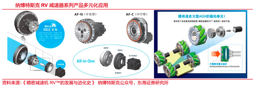 經典案例:根據《精密減速機RVTM的發(fā)展與進化史》納博特斯克公眾號、東海證券研究所等綜合資訊表明,納博特斯克將“動靜互換”作為自身核心技術, 注重新技術研發(fā)的同時持續(xù)拓寬應用落地。組件解決方案業(yè)務上,公司豐富 RV 減速器使用場景,針對精密機械制造、新能源等行業(yè),陸續(xù)開發(fā)出工作臺齒輪頭、風電偏航與變槳驅動 裝置、光伏定日鏡驅動跟蹤裝置等新產品。