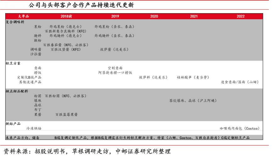 經典案例:根據招股說明書、草根調研走訪、中郵證券研究所等綜合資訊表明,寶立食品公司與 B 端大客戶在保持傳統(tǒng)大單品穩(wěn)定合作的同時持續(xù)開發(fā)新品深化合作。2018 年之前,公司針對頭部大客戶主要供應產品普遍為較為常規(guī)的腌料、裹粉、醬料等復調大單品。而 2020 年后,伴隨公司逐漸提升輕烹業(yè)務研發(fā)、產能基礎,公司與麥當勞、costco、山姆等客戶合作上從調味品向整體輕烹解決方案轉變。