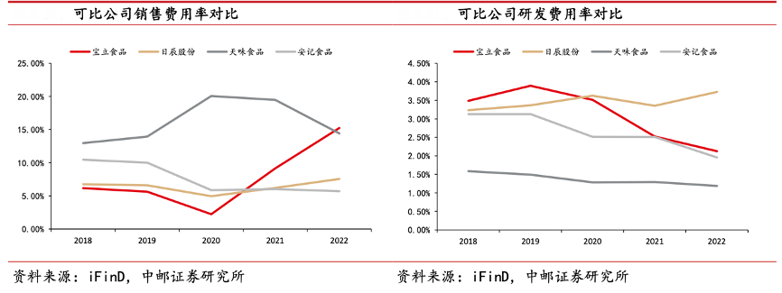 經(jīng)典案例:根據(jù)iFinD、中郵證券研究所等綜合資訊表明,寶立食品公司主要客戶為百勝中國、麥當(dāng)勞等餐飲行業(yè)巨頭,因此公司在營銷等方面的投入較少。2021 年起公司銷售費用率出現(xiàn)大幅上升的主要原因是收購空刻后為宣傳產(chǎn)品在營銷端進(jìn)行大量投入,2022 年公司銷售費用率為 15.25%,與主營 C 端的天味接近。公司為滿足大B 客戶較高頻率的產(chǎn)品更新迭代需求,公司在產(chǎn)品研發(fā)端投入較高。2022 年公司研發(fā)費用率為 2.13%,僅次于日辰股份。