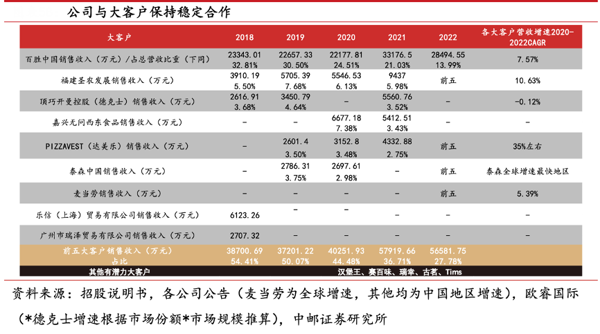 經(jīng)典案例:根據(jù)招股說明書、各公司公告、歐睿國際、中郵證券研究所等綜合資訊表明,寶立食品公司與大 B 端客戶合作穩(wěn)定,前五大客戶名單變動較小,其中百勝中國、圣農(nóng)發(fā)展、PIZZAVEST(達(dá)美樂)常年位居前五,且百勝中國長期穩(wěn)居第一。根據(jù) 2020-2022 年前五大客戶復(fù)合增速看,百勝、麥當(dāng)勞擴(kuò)店穩(wěn)健,達(dá)美樂近 3 年發(fā)展迅速增速達(dá) 35.3%,泰森中國和圣農(nóng)發(fā)展在預(yù)制菜領(lǐng)域也有較好表現(xiàn)。