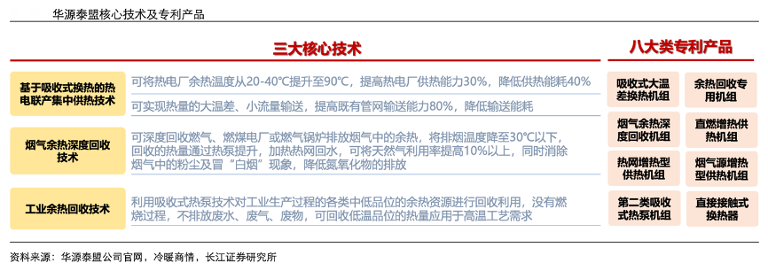 經(jīng)典案例:根據(jù)華源泰盟公司官網(wǎng)、冷暖商情、長(zhǎng)江證券研究所等綜合資訊表明,華源泰盟擁有三大核心技術(shù)和8 大類專利產(chǎn)品,可以在提高熱電廠和工業(yè)余熱設(shè)施的供熱能力的同時(shí),減低能耗,減少氮氧化物等污染物的排放,解決當(dāng)前低品位余熱利用中的痛點(diǎn)。