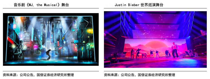 經(jīng)典案例:根據(jù)公司公告、國信證券經(jīng)濟研究所等綜合資訊表明,洲明科技公司為眾多重量級商業(yè)演出、頒獎典禮等大型文化活動打造絢麗舞臺和繽紛畫 面。例如,雷迪奧 CB5 LED 產(chǎn)品攜手 4Wall 以致敬 MJ 為主題的音樂劇《MJ, the Musical》精彩亮相百老匯,以一體化解決方案再現(xiàn)邁克爾·杰克遜音樂生涯的高光時刻。又如,雷迪奧為 Justin Bieber 世界巡演設(shè)計創(chuàng)意舞臺,為著名歌手 Ed Sheeran 世界巡演打造創(chuàng) 意舞臺、360°懸浮舞臺,帶來科技感十足的視聽盛宴。