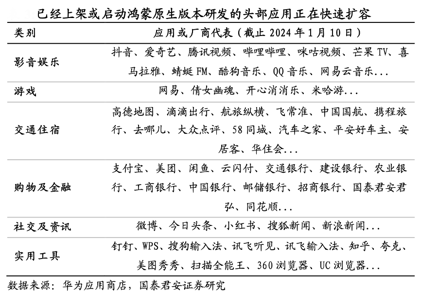 經(jīng)典案例:根據(jù)華為應(yīng)用商店、國(guó)泰君安證券研究等綜合資訊表明,截止 2024 年1月10日,已經(jīng)有支付寶、京東、高德地圖、嗶哩嗶哩、愛(ài)奇藝、同花順、網(wǎng)易游戲、米哈游、360 瀏覽器等頭部應(yīng)用啟動(dòng)或者完成鴻蒙原生應(yīng)用 Beta 版本的研發(fā)。同時(shí)華為應(yīng)用商店“鴻蒙先鋒”專(zhuān)區(qū)已上架超過(guò) 130 多款鴻蒙原生應(yīng)用軟件,其中包括抖音、美團(tuán)、微博、WPS、騰訊視頻等頭部應(yīng)用。
