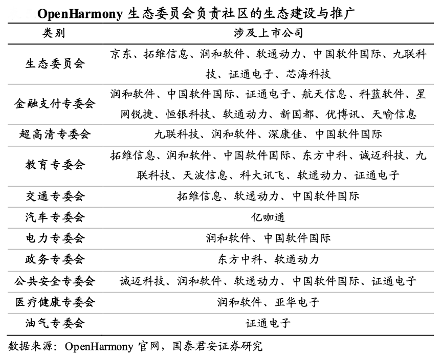 經(jīng)典案例:根據(jù)OpenHarmony官網(wǎng)、國(guó)泰君安證券研究等綜合資訊表明,OpenHarmony 生態(tài)委員會(huì)負(fù)責(zé) OpenHarmony 開(kāi)源生態(tài)建設(shè)與推廣,目前委員單位包括華為、京東、開(kāi)鴻智谷(拓維信息)、潤(rùn)和軟件、軟通動(dòng)力、深開(kāi)鴻(中國(guó)軟件國(guó)際)、九聯(lián)科技、證通電子、芯??萍季偶?。生態(tài)委員會(huì)下設(shè)金融支付、超高清、教育、交通、汽車(chē)、電力、政 務(wù)、公共安全、游戲、醫(yī)療健康、油氣等產(chǎn)業(yè)專(zhuān)委會(huì),由各產(chǎn)業(yè)鏈主管 單位、設(shè)備廠商、應(yīng)用廠商、客戶(hù)等構(gòu)成,其中涉及到的上市公司統(tǒng)計(jì)如下: