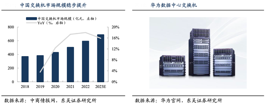 經(jīng)典案例:根據(jù)中商情報網(wǎng)、華為官網(wǎng)、東吳證券研究所等綜合資訊表明,國產(chǎn)交換機市場規(guī)模穩(wěn)定增長,華為優(yōu)勢顯著。根據(jù) IDC 數(shù)據(jù),華為核心數(shù)據(jù)中心交換機 CloudEngine 16800 系列已達到世界領(lǐng)先水平,整機容 量超過 300Tbps,位居全球第一。2023年6,華為發(fā)布首款 800GE 數(shù)據(jù)中心核心交換機 CloudEngine 16800-X 系列,正式開啟數(shù)據(jù)中心 800GE 時代。根據(jù) IDC 數(shù)據(jù)顯示,華為 在 2023H1 以 35.8%的市場份額,蟬聯(lián)中國以太網(wǎng)交換機市場第一,自 2016 年至今,華 為已連續(xù) 7 年穩(wěn)居該領(lǐng)域市場第一。