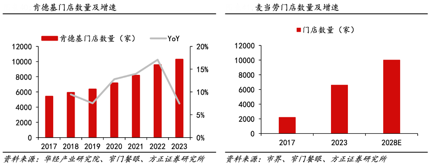 經(jīng)典案例:根據(jù)華經(jīng)產(chǎn)業(yè)研究院、市界、窄門(mén)餐眼、方正證券研究所等綜合資訊表明,近年來(lái)我國(guó)肯德基門(mén)店數(shù)量不斷增 長(zhǎng),并計(jì)劃未來(lái)將總店數(shù)擴(kuò)展到 20,000 家以上。公司自 2018 年進(jìn)入麥當(dāng)勞的供應(yīng)鏈,目前已與麥當(dāng)勞建立良好的合作關(guān)系。 麥當(dāng)勞計(jì)劃 2028 年,將中國(guó)門(mén)店數(shù)量從 6000 家增加至 10000 家,意味著未來(lái)四 年內(nèi)麥當(dāng)勞每年將以前所未有的速度在中國(guó)開(kāi) 1000 家店。