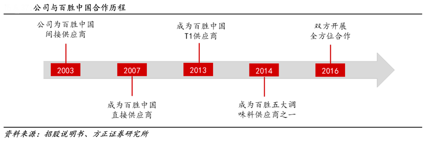 經(jīng)典案例:根據(jù)招股說(shuō)明書(shū)、方正證券研究所等綜合資訊表明,寶立食品公司與百勝中國(guó)合作近 20 年,于 2013 年成為其 T1 供應(yīng)商,于 2014 年成為百勝五大調(diào)味料供應(yīng)商之一,其公司服務(wù)百勝中國(guó)下屬所有品牌,參與百勝中國(guó)新品開(kāi)發(fā)、菜單設(shè)計(jì)等,產(chǎn)品延伸到腌料、撒粉、調(diào)味醬、沙拉醬、果醬、調(diào)理包、飲品小料和百勝新零售的輕烹食品等多個(gè)品類。