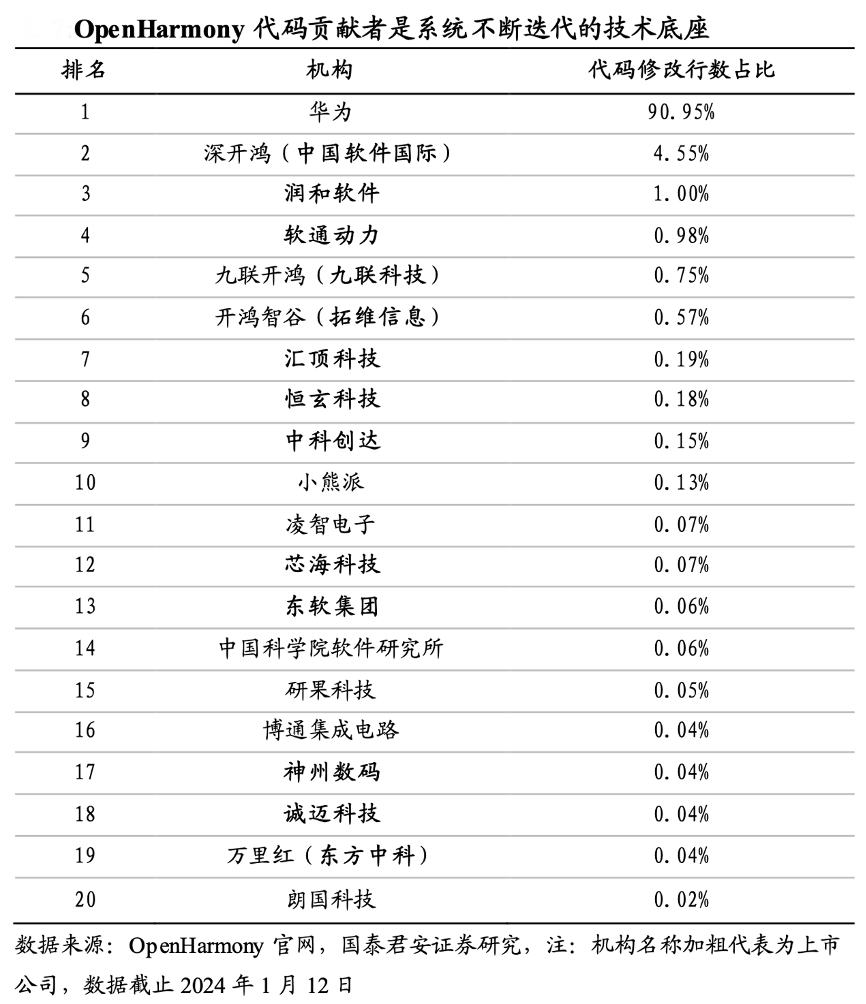 經(jīng)典案例:根據(jù)OpenHarmony官網(wǎng)、國泰君安證券研究等綜合資訊表明,OpenHarmony 代碼主要貢獻者是推動整個 OpenHarmony 系統(tǒng)不斷迭代的技術底座。根據(jù) OpenHarmony 官網(wǎng),截止 2024 年 1 月 12 日,華為貢獻了 90.95%的代碼修改量,依舊是最大的代碼貢獻者,中國軟件國際 (深開鴻)、潤和軟件、軟通動力、九聯(lián)科技(九聯(lián)開鴻)、拓維信息 (開鴻智谷)的修改量位居行業(yè)前列。